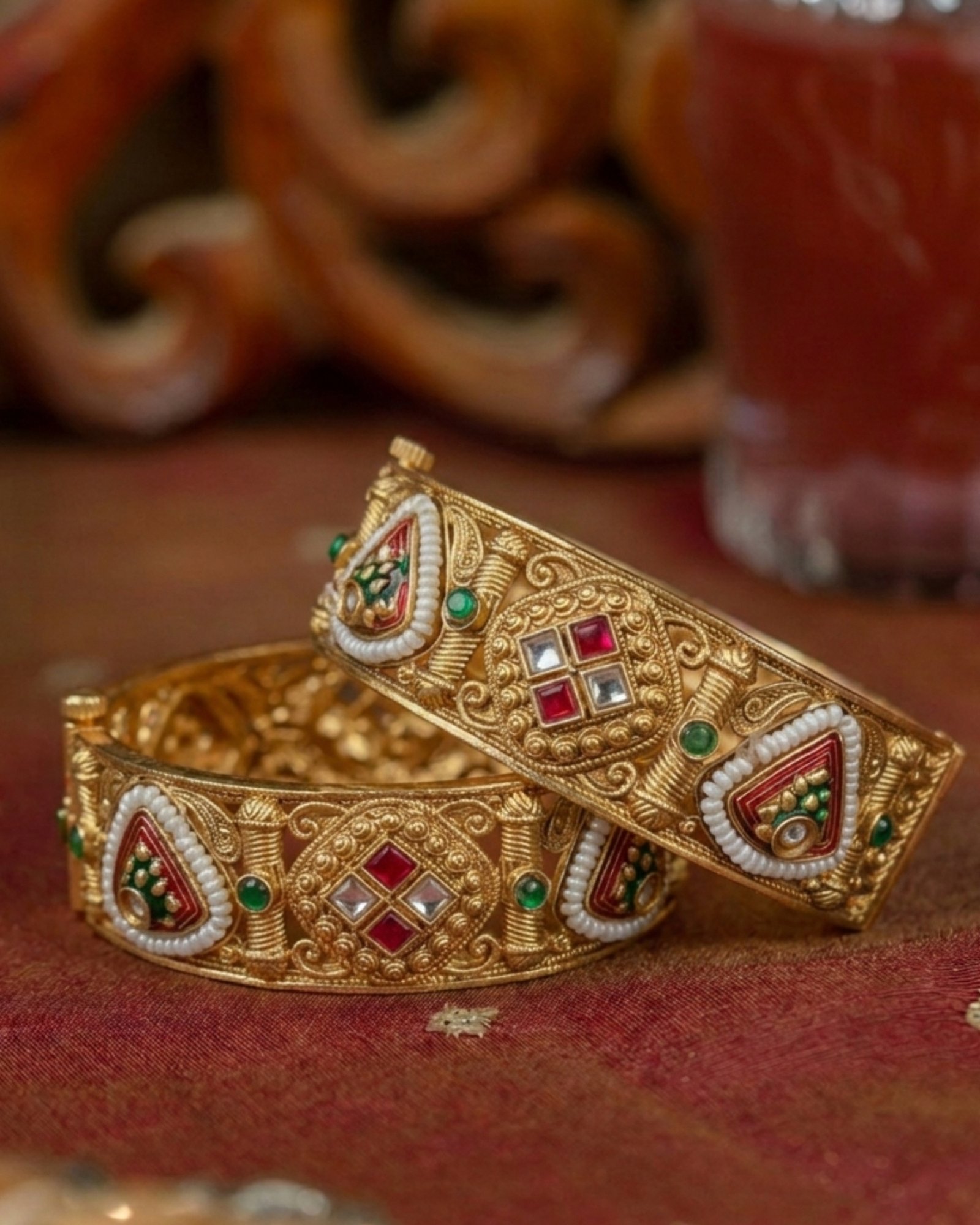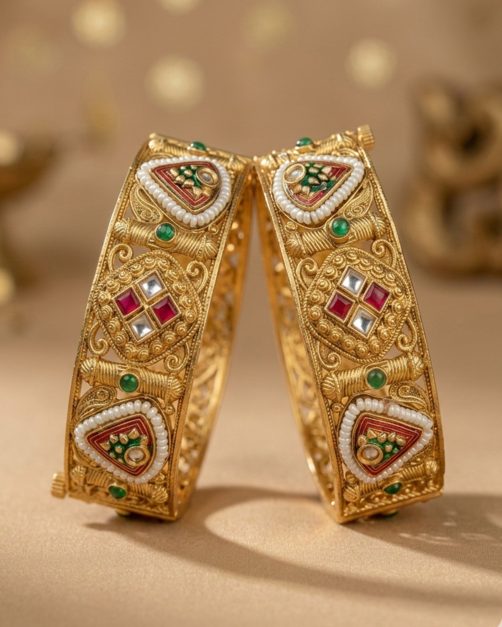 The detailed motifs and structured silhouette make these bangles a statement piece for weddings, festive occasions, and cultural celebrations. Designed for elegance and comfort, they pair beautifully with sarees, lehengas, and ethnic suits, adding a touch of royalty to every look.